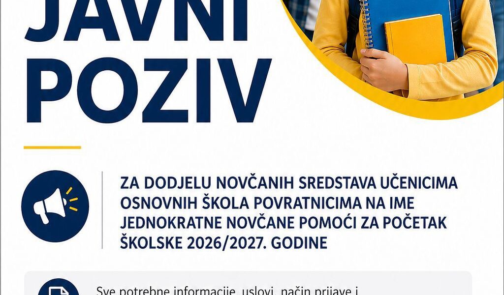 Javni poziv za dodjelu novčanih sredstava učenicima osnovnih škola povratnicima na ime jednokratne novčane pomoći za početak školske godine za 2026/2027 godinu